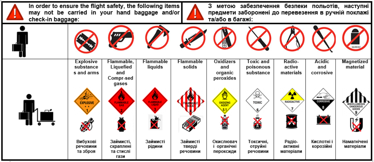 З метою забезпечення безпеки польотів, наступні предмети заборонені до перевезення в ручній поклажі та багажі: